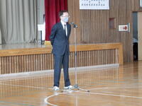 その後、体育館で思い出を語る会が行われました。県PTA連合会からの感謝状贈呈式、5・6年生による鶏舞披露、思い出ビデオ上映、ゆかりの深い方からのスピーチなどで金沢小41年間の思い出にひたりました。最後は、金沢小、金沢地区の子供たちのこれからの健康を願い、万歳三唱で会を閉じました。